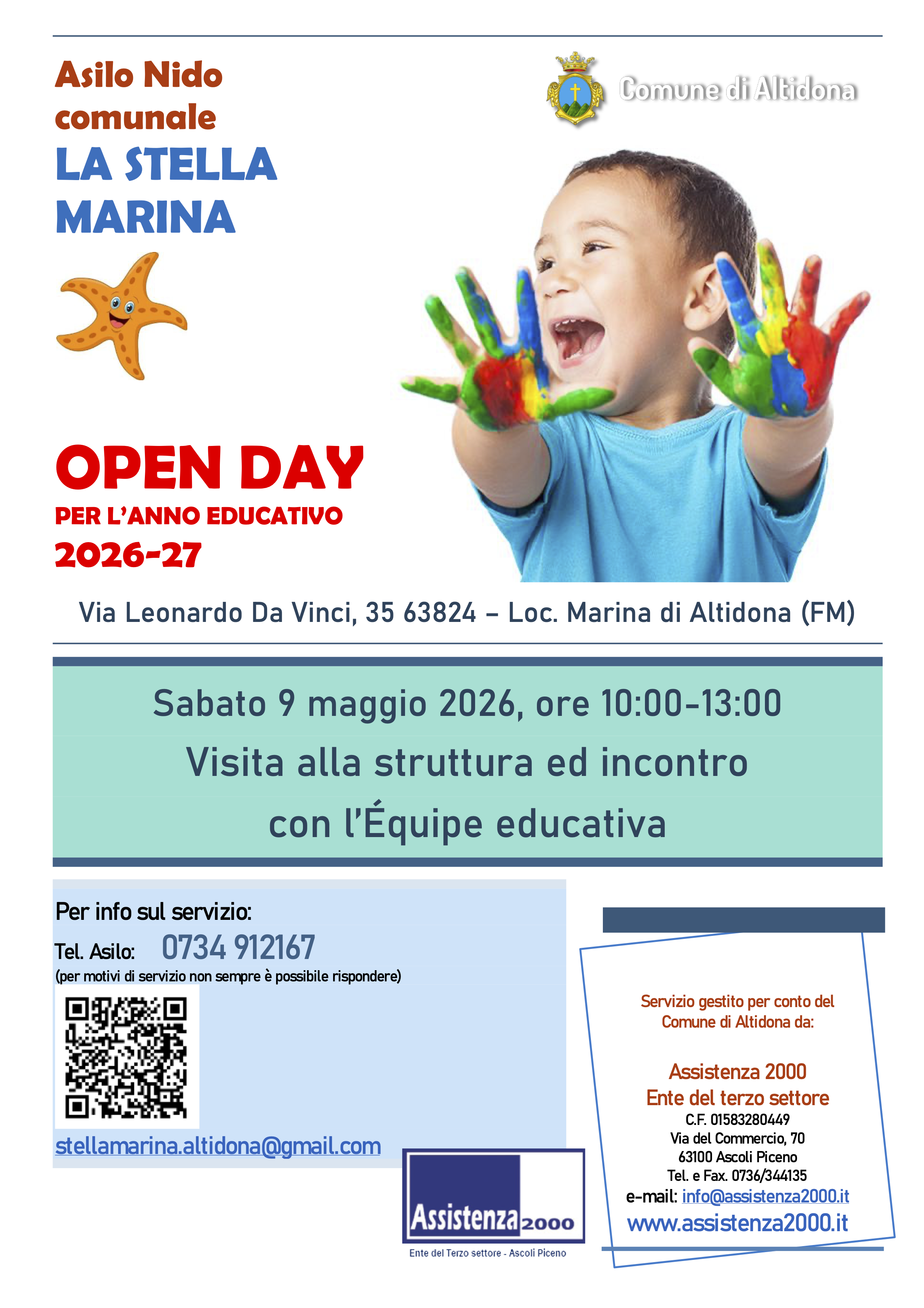 Si comunica che sono aperte le iscrizioni per l’anno educativo 2026/2027 al Nido d’Infanzia comunale “La Stella Marina”, sito in Via Leonardo da Vinci n. 35 – Marina di Altidona (FM), rivolto ai bambini di età compresa tra 3 mesi e 3 anni.
